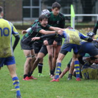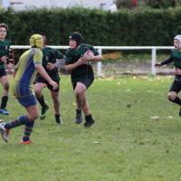 Début de rêve de nos cadets – dans des conditions encore une fois dantesques – avec Paulo, en jambes, qui dès la seconde minute allume la première mèche grâce à une maître passe au pied bien suivi par Ange qui aplatit dans la foulée aux pieds des poteaux (0-5, 2′). Waouh ça c’est de l’entame Monsieur ! Les verts et noirs continuent à dominer la partie de « waterpolo » avec Romain qui perce et trouve en relais, Alessandro qui claque le second essai de la partie (0-10) après il faut le noter, pas moins de 7 temps de jeu qui ont donné le tournis à la défense montessonnaise !